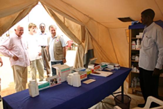Foto | Foto 5 von 41 | Foto  |  | | Behandlungszelt der DRK-Gesundheitsstation in As Salam. Ins Zelt schauen v.l. Dr. Seiters, der DRK-Delegierte Mario Helwig und Jan Hofer |