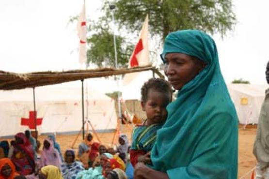 Foto | Foto 29 von 41 | Foto  |  | Eine Frau wartet, dass ihr Kind in der DRK-Gesundheitsstation in El Fasher behandelt wird. Das sechsköpfige DRK-Team behandelt zusammen mit dem Sudanesischen Roten Halbmond hier im Sommer 2004 über 200 Patienten pro Tag