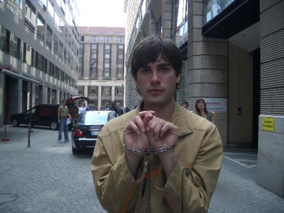 Drew Fuller in Handschellern bei Dreharbeiten zum Action Thriller "Dark Ride" in Berlin